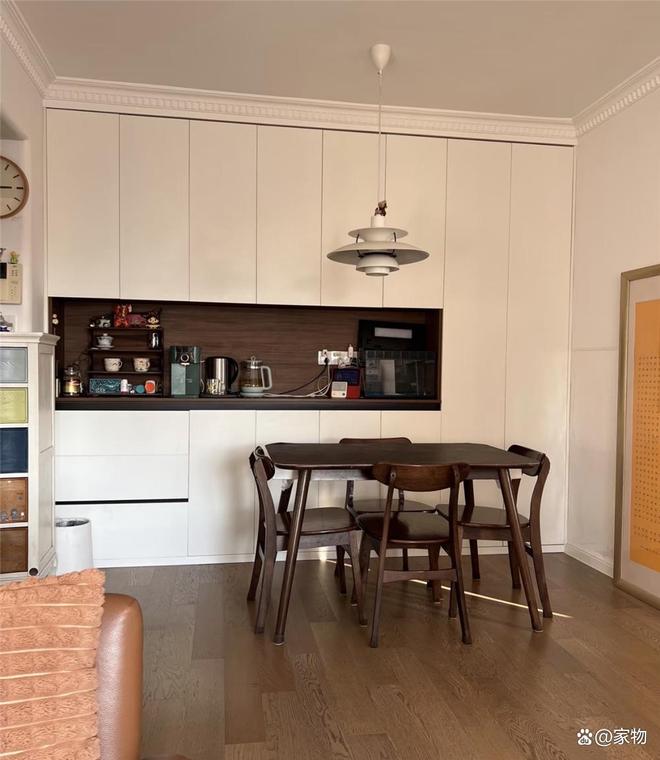 在四人位餐桌旁边,直接将餐边柜融入通顶式高柜中,既有餐边柜收纳水吧的作用,高处又可以收纳一些杂物和备用品,减轻家里的收纳负担。
