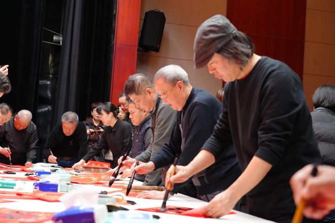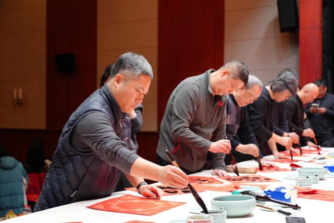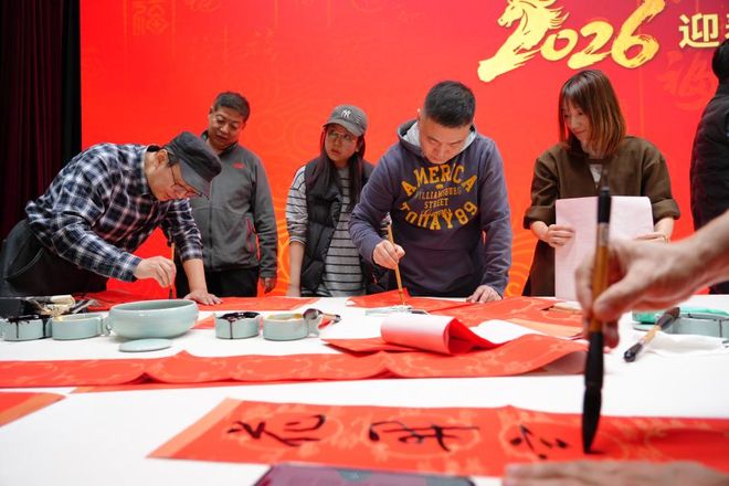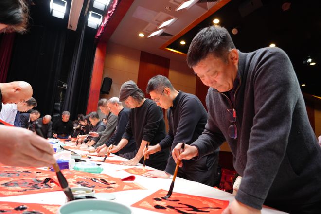 活动现场,艺术家们挥毫泼墨。魏广君、谢小铨、李晓军、蔡大礼、洪厚甜、王厚祥、方放、杜浩、程兴林、王东声、赵际芳、梅跃辉等十余位书画家与新影职工并肩而立,红纸铺展,墨香四溢。苍劲有力的“福”字和寓意吉祥的春联在艺术家的笔下呈现,既有“春风入喜财入户,岁月更新福满门”的传统韵味,也有“马年大吉、马到成功”的时代新意。新影离退休老同志们围在一旁,或观摩学习,或帮忙铺纸研墨,现场欢声笑语,暖意融融。