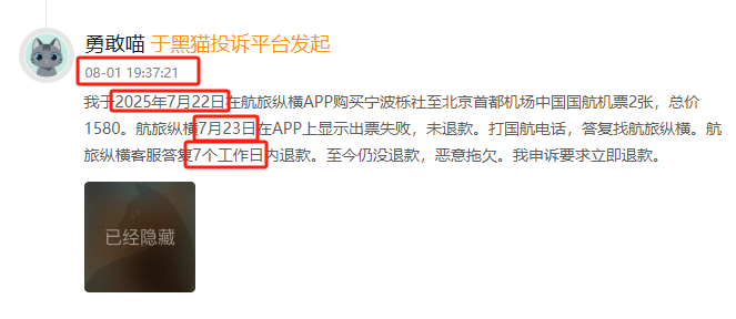 该网友称其联系了中国国航,对方要求其找航旅纵横,而航旅纵横的客服表示7个工作日内退款,截至其发起投诉时(8月1日晚),尚未收到退款。