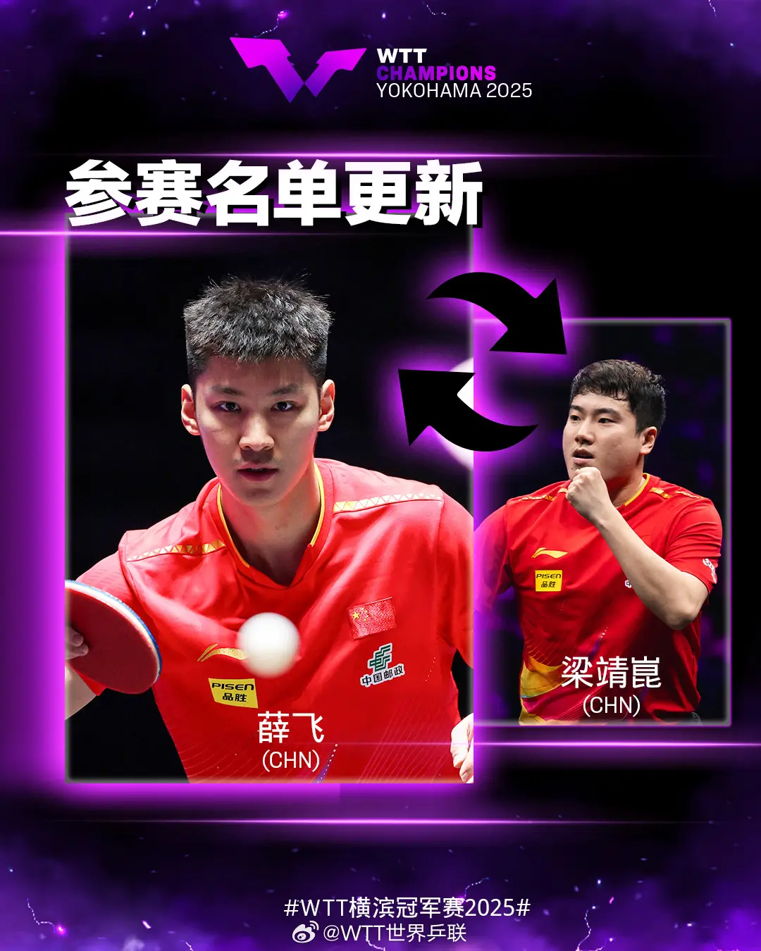 8月1日消息,WTT横滨冠军赛更新参赛球员名单,国乒的梁靖崑退赛,薛飞递补参赛;德国的弗朗西斯卡退赛,法国的西蒙·高茨递补参赛。在梁靖崑退赛之后,男单前四号种子变为林诗栋、王楚钦、张本智和和莫雷加德。