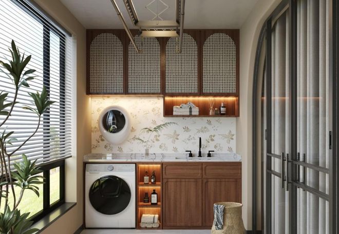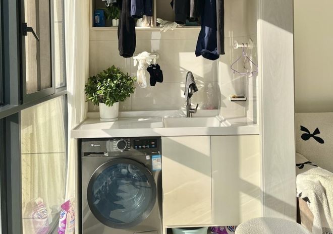 阳台洗漱区,一般选择的位置就是南向或者是东向的生活阳台。上午一般有充足的自然阳光,而且要具备上下水,还有可以改造的可能。
