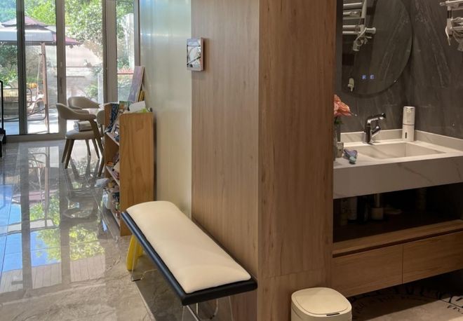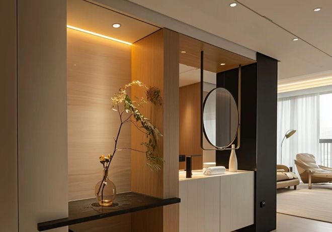 装修建议:玄关洗漱区可以结合智能系统,比如入户自动开启照明,播放洗手提示音乐,让我们的生活也具有仪式感。