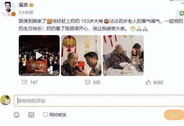我刷到谢楠微博那张照片,第一眼注意的不是吴京的膝盖印,是奶奶另一只空着的手——她没摸孙子脸,先往吴京头顶上揉了一把,像给小孩顺毛。那一刻突然懂了,硬汉不硬汉,跟腱子肉无关,得看他在最松弛的地方肯不肯把盔甲卸了。