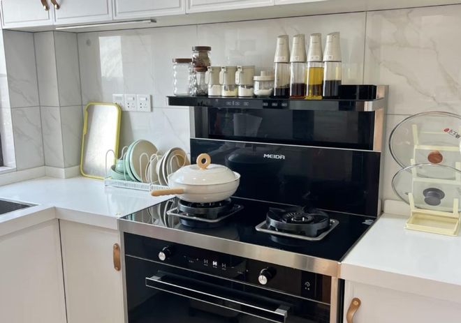 但是,更吸引小户型的是它的空间整合能力。一台集成灶解决了烟机灶具,蒸烤箱的功能,原本需要单独放置的蒸烤箱和消毒柜空间被省出来了,可以用来做抽屉,收纳,碟的碗。