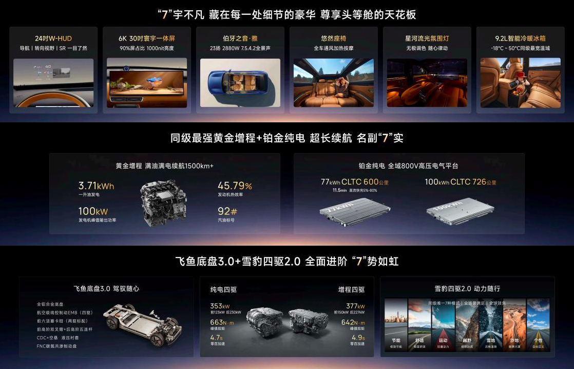 动力数据也亮眼:增程版综合功率377kW,峰值扭矩642N·m,零百加速4.9秒;纯电版更猛,4.7秒破百。一台近5米长的大家伙,能有这加速底气,超车变道那叫一个从容。再加上同级唯一的7种驾驶模式,雪地沙地都能招呼,偶尔出去野营一下,它也能胜任。