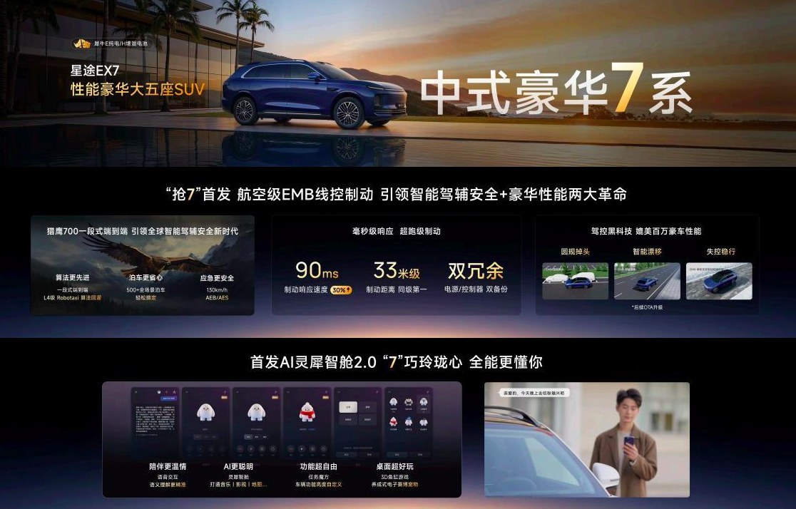 在EX7身上,我看到的豪华不是简单的真皮堆砌,而是EMB带来的极致安全,是AI大模型带来的情绪价值,是1500公里续航带来的出行自由。