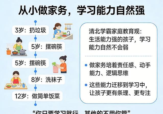 有的家庭总爱把孩子的事业和生活分得清清楚楚,学习归学习,家务别管。可在不少清北学子的家里,从小就让孩子参与力所能及的事。三岁左右学着扔垃圾,五岁帮忙摆碗筷,八岁自己洗袜子,到了十二岁甚至能简单做顿饭。这些小事积累下来,培养出的责任感和动手能力,会悄悄转移到学习上。孩子做作业时更有条理,遇到问题也愿意一步步拆解,而不是一头雾水乱撞。生活能力强了,学习那股韧劲往往也跟着上来。