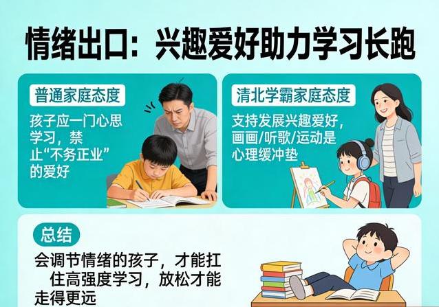 兴趣爱好在一些家长眼里像是分散注意力的东西,可在这些学霸家庭里却被当成宝贝。孩子画画累了、听听歌放松,或者压力大了去运动一下,这些看似不务正业的时刻,其实是情绪的缓冲区。会调节自己的孩子,更能扛住高强度的学习压力。在竞争激烈的环境中,懂得适时松口气,往往能走得更长远一些。你有没有想过,孩子那点小爱好,说不定正是他们坚持下去的秘密武器?