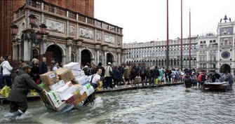 当地时间10月27日,由于遭遇强冷空气,意大利水城威尼斯遭遇强降雨和洪水的侵袭,著名的威尼斯地标性建筑圣马可广场完全被淹没,但洪水下,游客们依旧络绎不绝,游兴不减。