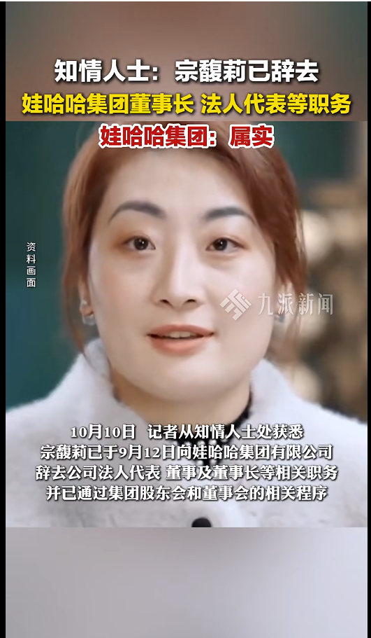 10月10日晚,多家媒体报道,从知情人士处获悉,宗馥莉已于9月12日向娃哈哈集团有限公司辞去公司法人代表、董事及董事长等相关职务并已通过集团股东会和董事会的相关程序。