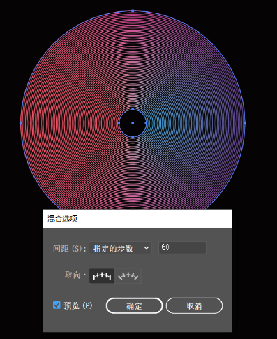 2. 选择两个正圆形,按【Ctrl+Alt+B】键将两个图形混合;用鼠标双击混合工具,在弹出的“混合选项”窗口中设置“指定步骤”为60,点击“预览”后的“确定”按钮。