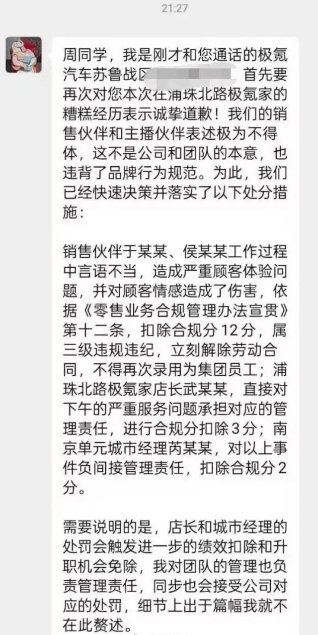 面对舆论海啸,极氪苏鲁战区总经理王坤当晚 9 点 30 分紧急联系顾客致歉,并甩出“硬核罚单”通报处理结果。
