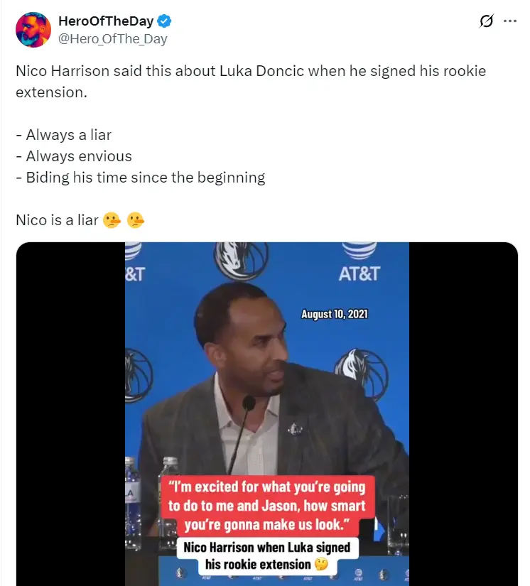 在米卡-帕森斯申请交易后,独行侠GM尼克-哈里森再一次被当地的媒体炮轰,独行侠媒体HeroOfTheday写道:哈里森在东契奇签下新合同(上一份合同)时曾说“我们很期待你与基德一同做到点什么,以及让我们看到你的球商有多么出色吧”,哈里森总是谎话连篇,嫉妒心很信,从一开始就在等待时机送走卢卡,哈里森就是一个彻头彻尾的骗子。