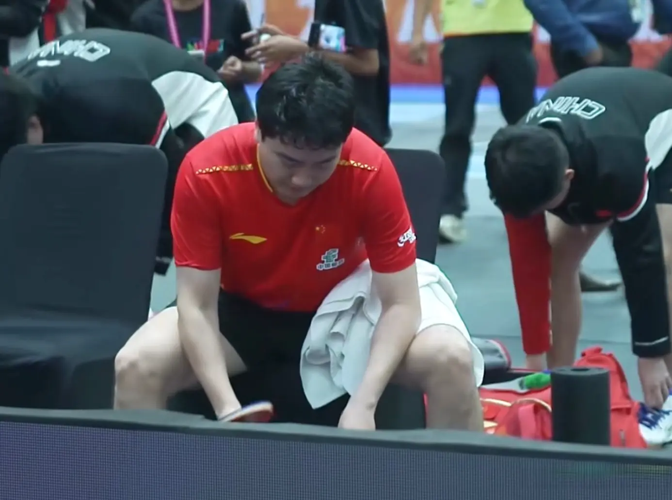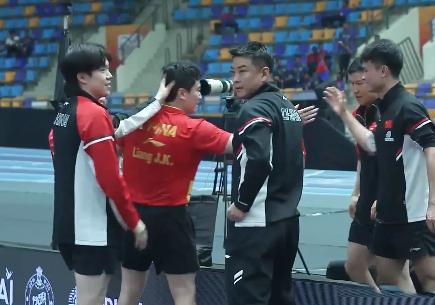 后续林诗栋也在拍梁靖崑的身体。其实林诗栋也是一个关键人物,第三盘他顶住压力,这才有了后续王楚钦和梁靖崑连下两盘,他们都展现了男团的凝聚力。