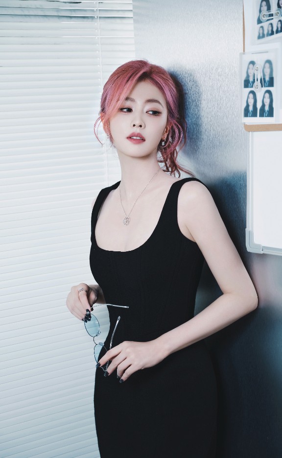 这次的穿搭更是将“反差感”玩明白了!一件黑色方领修身长裙,剪裁利落又凸显身材曲线,自带高级感的黑色中和了粉发的甜,让整体风格在甜酷之间找到完美平衡。她一会手持金属框眼镜,靠在墙边,眼神慵懒又魅惑;一会抱着笔记本电脑,坐姿飒爽,职场女精英的气场全开;一会又拿起复古电话,粉发与黑裙的碰撞,在办公室场景里打造出“时尚修罗场”,把日常的办公环境变成了她的时尚秀场。