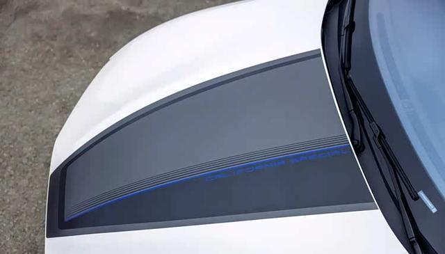 外观层面,California Special套件的核心在于复古设计语言的运用。前机舱盖配备专属拉花,官方称设计灵感来自加州落日余晖,配有"California Special"标识。车辆前脸采用立体化封闭式格栅,中央嵌入蓝色野马徽标。五辐式轮辋在连辐处刻有"GT/CS"缩写标识,车门位置增加"Mach-E 4"蓝色铭牌,尾部GT标识内部同样融入"California Special"字样。