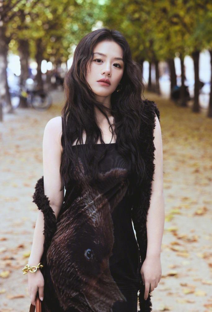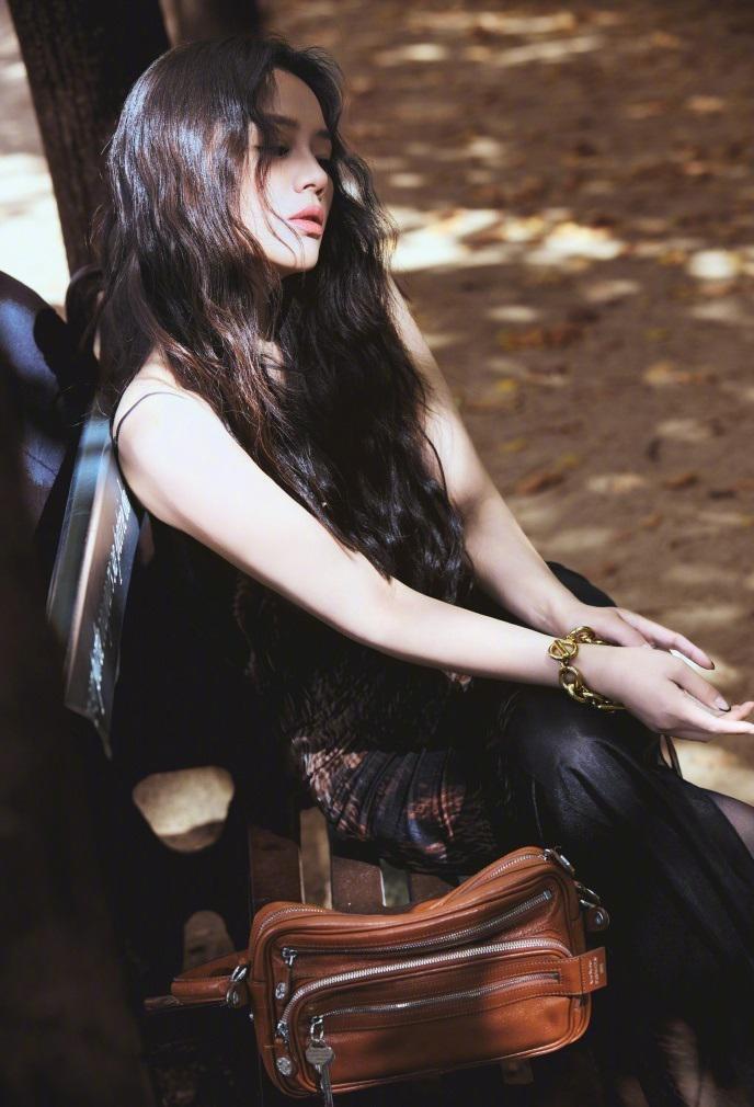 背身回眸的镜头堪称经典,吊带裙露出优美的肩颈线条,与身后斑驳光影的树林构成和谐画面。这种 " 人景合一 " 的拍摄理念,恰似她近年来选择的影视作品:总是能找到与自身气质完美契合的角色。