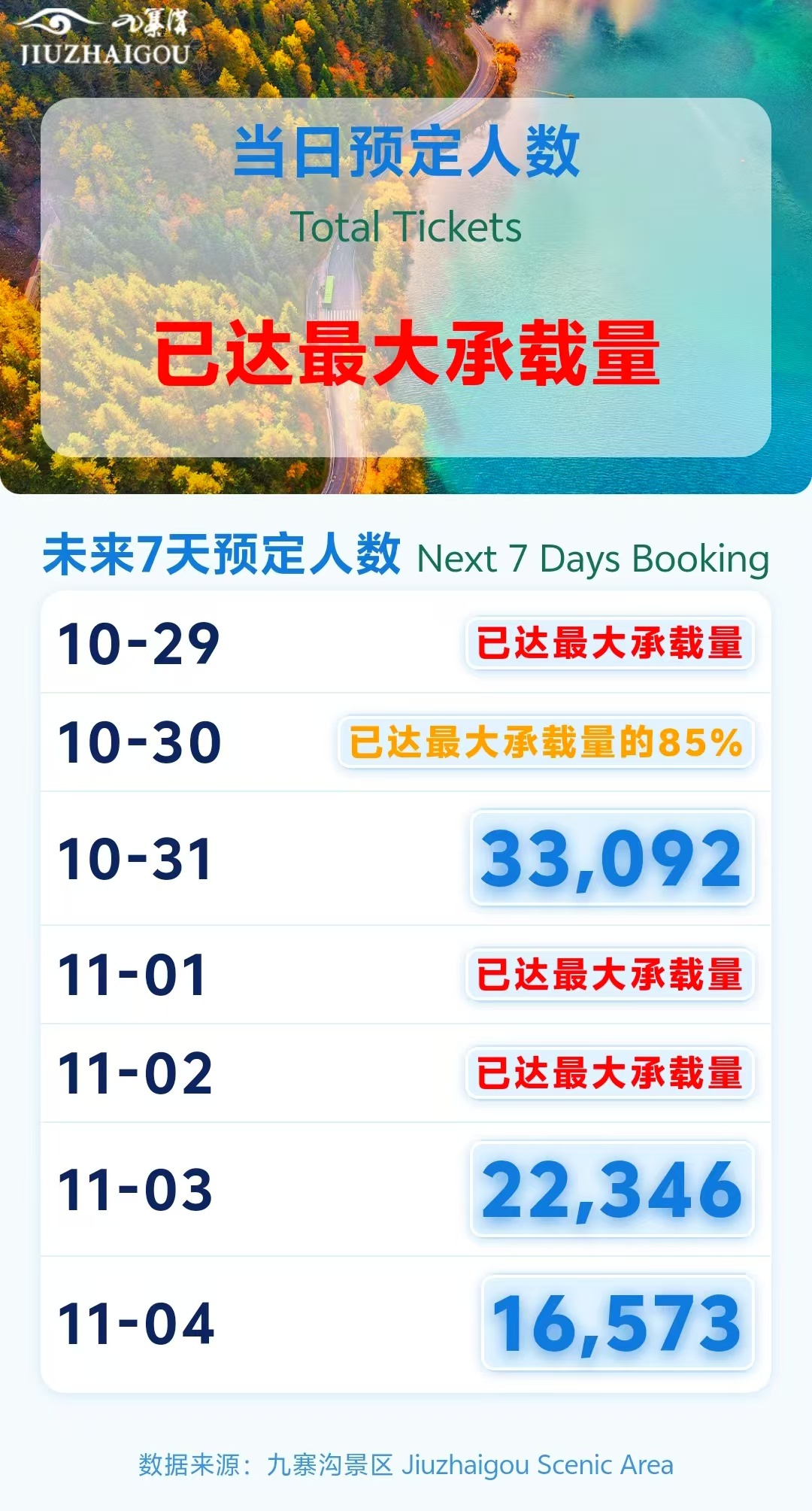 九派新闻注意到,10月21日至28日,景区门票预订均已达到最大承载量4.1万人次。截至10月28日17时,在未来7天预订人数中,10月29日、11月1日、11月2日已达最大承载量。