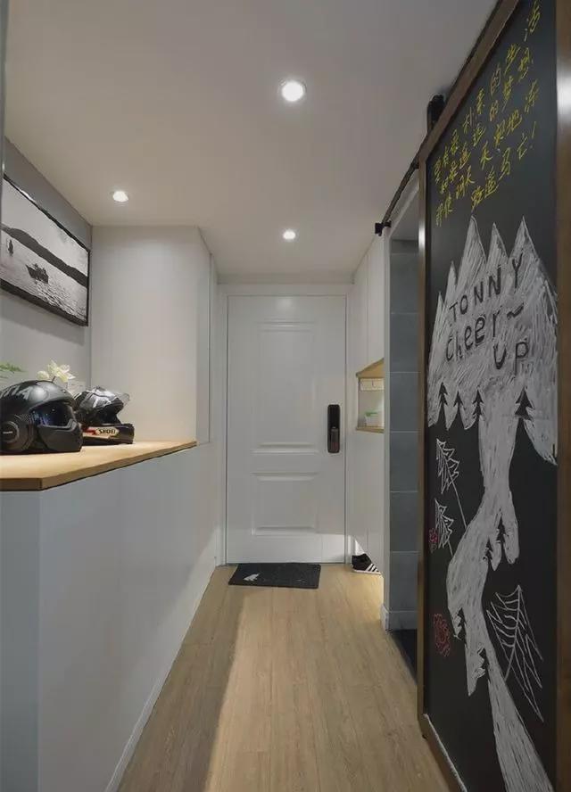 另外,过道上还设计了一面黑板墙,没事的时候可以在上面发挥想象尽情创作,或是作备忘录使用,特别有意思。黑板墙和鞋柜中间是卫生间的位置,外面用谷仓门隔断,美观实用。