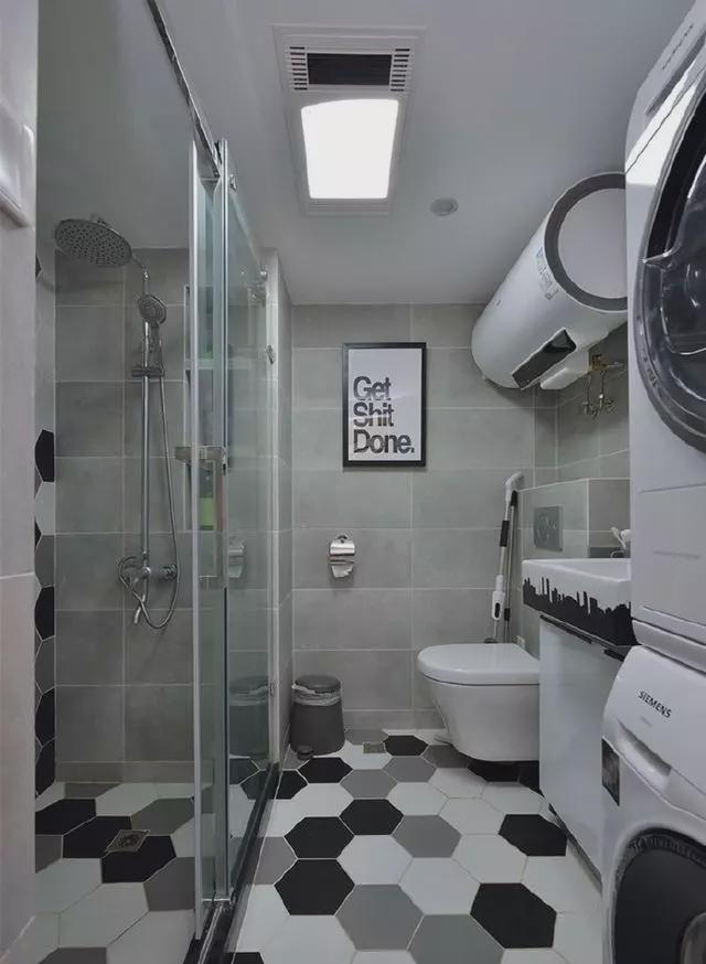 卫生间里面,洗衣机和烘干机都是叠放在一起的,比较节省空间,也能让卫生间整体显得干净整洁不少,淋浴区用玻璃门做了干湿分离,不用担心潮湿问题,显得空间通透又明亮。地面铺贴经典黑白灰六角砖,充满个性与时尚,立体感很强。