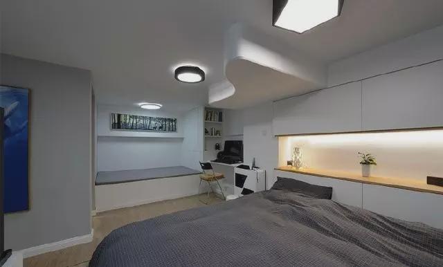 床头右边打造了成了小型工作区,墙上做了置物格,专门用来存放书籍。旁边还有一个“假飘窗台”,在上面铺上软垫就成为了一个舒适的休闲区,工作或者学习累了刚好有一个这样的地方让人小憩一下。