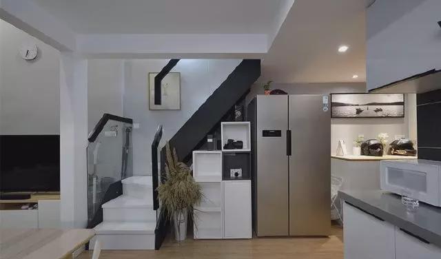 楼梯下方的空间也得到了充分利用,放了一个成品储物柜增加收纳,旁边还有一个大大的冰箱,高度正好与柜子形成阶梯式, 增加了空间的灵动性,整体感非常强。