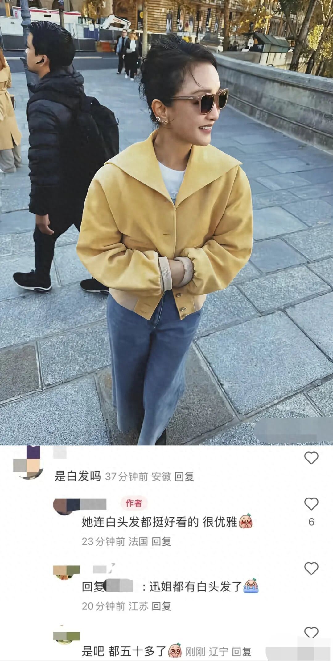近日,周迅现身巴黎时装周,打扮随性,头上的白发丝丝可见。
