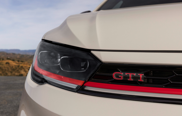 新车在外观方面,采用白色车漆,延续了GTI车型的设计风格,中网的镀铬饰条和红色饰条贯穿至两侧的大灯,这也是GTI车型的一大特点,中网右侧还提供红色GTI字母标识,大灯组采用矩阵式设计,中网采用菱形进气格栅,前包围还经过一些运动化点缀,让车头的运动氛围更加强烈。