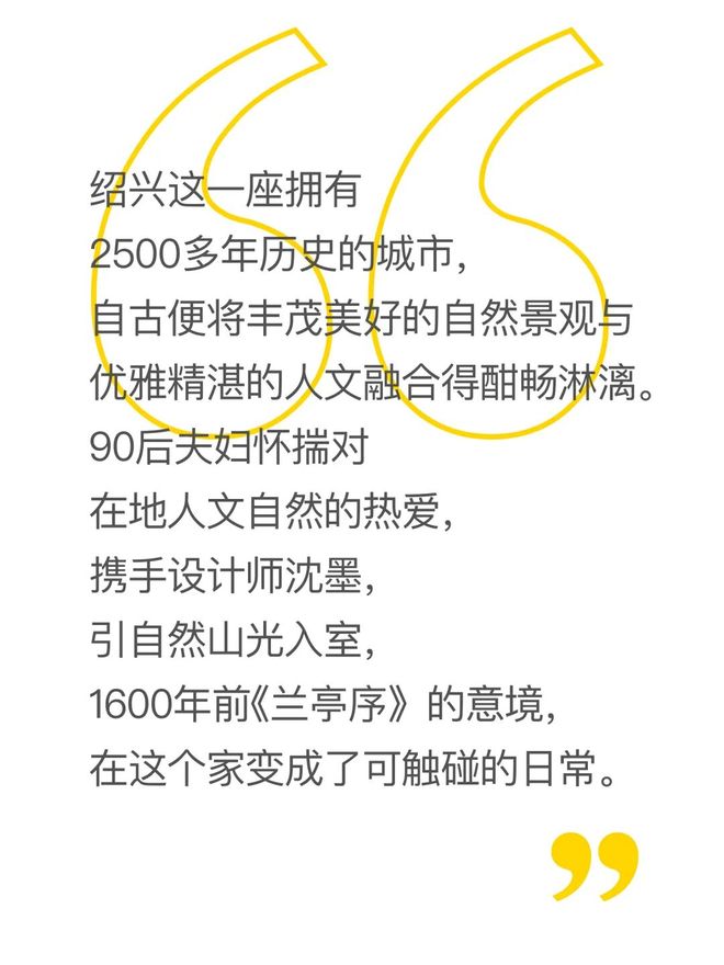 “崇山峻岭,茂林修竹。清流激湍,映带左右。”也许我们无法真正感知1600多年前王羲之因绍兴山水而执笔挥毫时的快意潇洒,但在这一个家,自然相融且诗意栖居的日常,已然成为了一首当代的《兰亭序》。