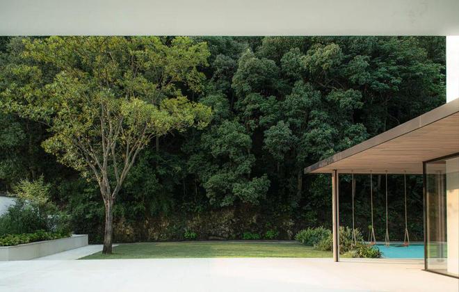 例如从一楼玄关开始,经过中西厨和餐厅区域,空间通道中的光线会越来越明亮,豁然开朗之处,便是映入眼帘的整座山,和山下的湖泊——泳池,当目光的焦点落在泳池边下沉式沙发区那一颗姿态万千的树木之上时,更让人忍不住继续拾步向前。