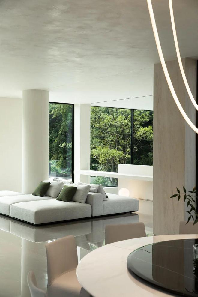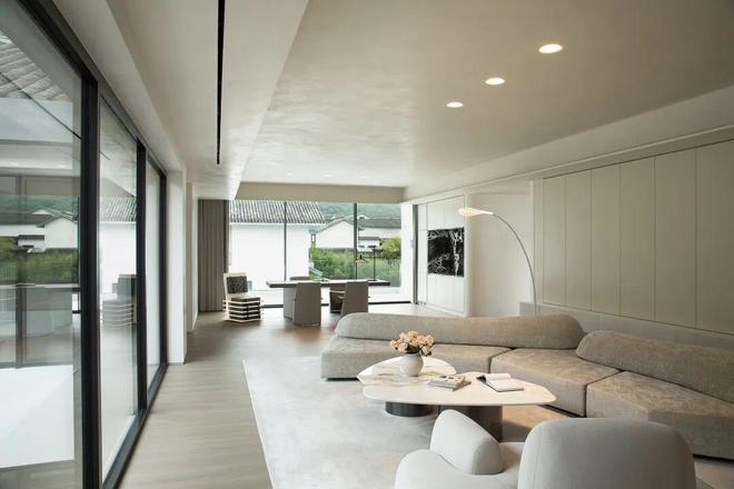 无论是设计师沈墨以往的作品,还是这座私宅,“当代极简”都是清晰可见的语言。空间中没有过多材料堆砌,新风、收纳、甚至是服务人员的动线都被干净且有效地藏于空间各处,大量的留白被充分给予到了周边的自然风貌、室内的艺术品以及生活于其中的人的身上。