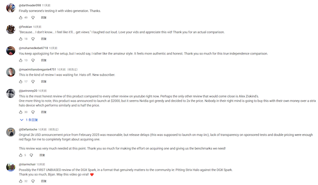 幸好油管博主Bijan Bowen做了一次深入对比,我们就借用他的数据来看看,从网友评论看该博主的测试被称赞称为真正独立客观,最为诚实,而其他类似测试都像是DGX Spark的广告。