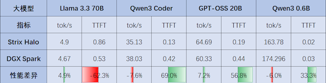 但是TTFT,也就是输出第一个token的时间,AMD Strix Halo取得了三胜一负的好成绩,而且领先幅度都非常大, NVIDIA DGX Spark只是在Llama上赢了一次。