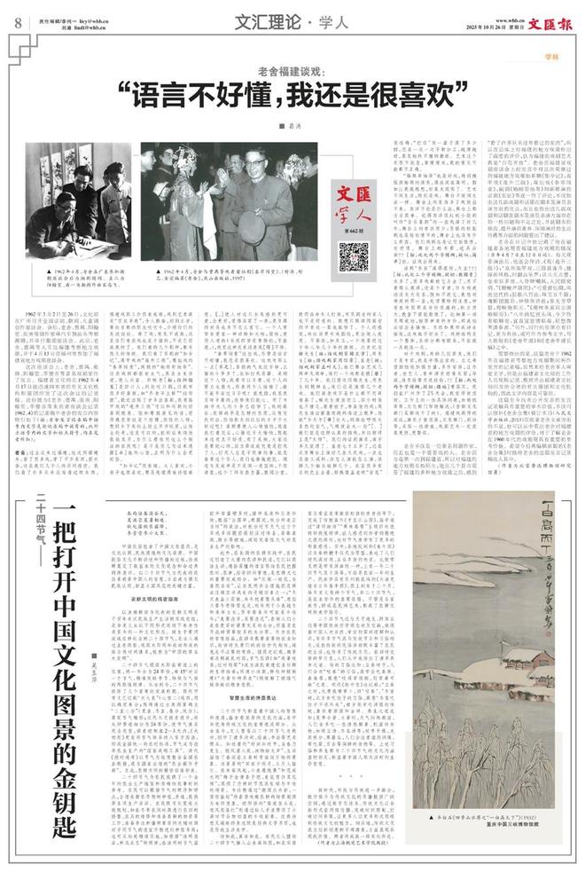 老舍在日记中也记载了他在福建省各地观看福建地方戏剧的情况(当年4月7日至12日日记)。每天观看演出后,他还会作诗。《观〈连升三级〉》:“泉州高甲戏,三级喜连升,独辟新风格,时翻古乐声;状元无点墨,皇帝似多情,入骨肆嘲讽,人民眼更明。”《赠鲤声剧团》:“可爱莆仙剧,风流世代传;弦歌八百曲,珠玉五千篇;魂断团圆后,神移笑语前;春光芳草碧,莺啭艳阳天。”《观林务夏同志演贻顺哥》:“八年尚忆钗头凤,今夕欣看贻顺哥,宜喜宜悲情似海,轻愁微笑漾春波。”另外,同行的张庚亦有日记,更为具体,或可作为参考文字,写入新版的《老舍年谱》和《老舍年谱长编》之中。