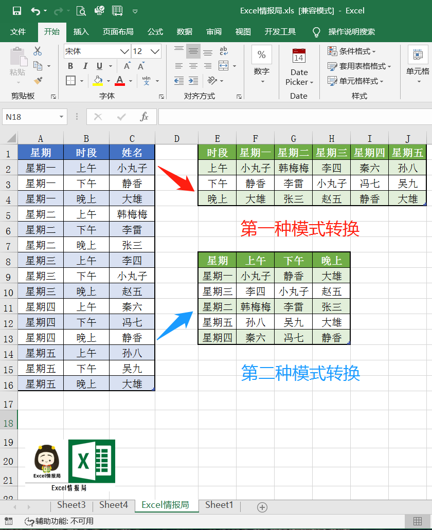 下面左图是一份 流水账式的值班表,为了便于打印张贴,现在需要使其变成这右图这样的样式: