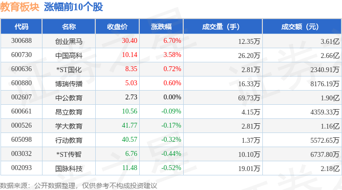 证券之星消息,10月29日教育板块较上一交易日上涨0.2%,创业黑马领涨。当日上证指数报收于4016.33,上涨0.7%。深证成指报收于13691.38,上涨1.95%。教育板块个股涨跌见下表: