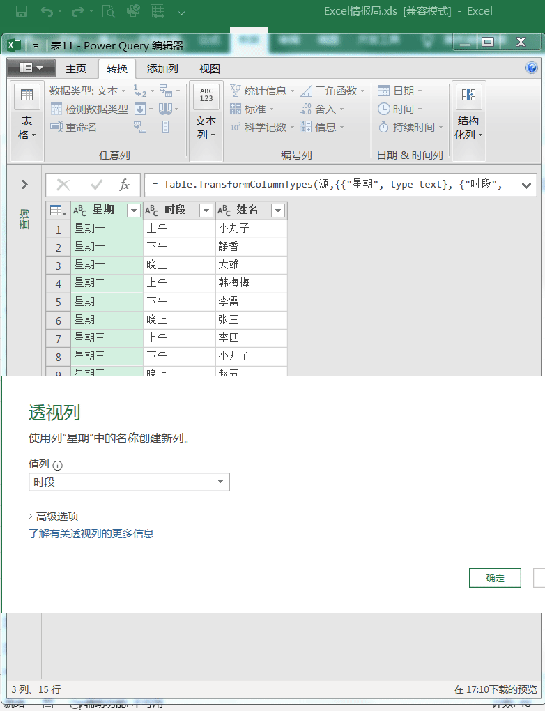 只要选中“星期”列,然后点击“转换”选项卡下面的“透视列”功能,弹出“透视列”的对话框。