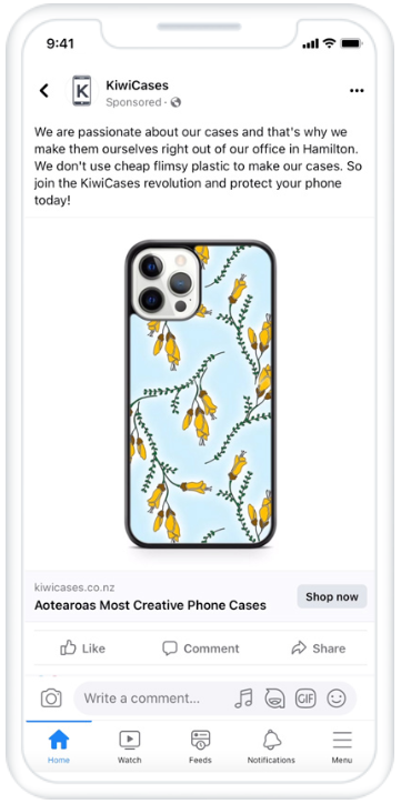 两个单元都投放了照片广告,展示公司以植物或露营为主题的有趣手机壳,以及诸如以下信息:“我们对我们的手机壳充满热情,这就是为什么我们直接在汉密尔顿的办公室制作它们。因此,如果您正在寻找能让某人脸上露出笑容的礼物,请浏览我们的最新设计并放心订购!”所有广告都包含一个“立即购买”按钮,该点击链接到公司的网站以供购买。
