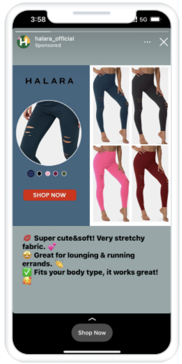 Advantage+应用程序允许 Halara 上传多达 50 张不同的图片、5 个不同的标题和 5 个不同的号召性用语。然后该活动通过组合所有可能的组合来动态化创意,以发现哪个组合反馈最佳结果,然后向相关受众提供效果最好的创意广告。由此产生的图片广告展示了 Halara 的运动服产品,以及号召性用户按钮,供观众通过 App Store 或 Google Play 安装该品牌的 APP。