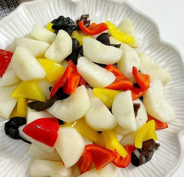 荸荠:200g、木耳:一把、彩椒:红黄各半个、盐:少许、糖:少许、油:适量、清水:适量