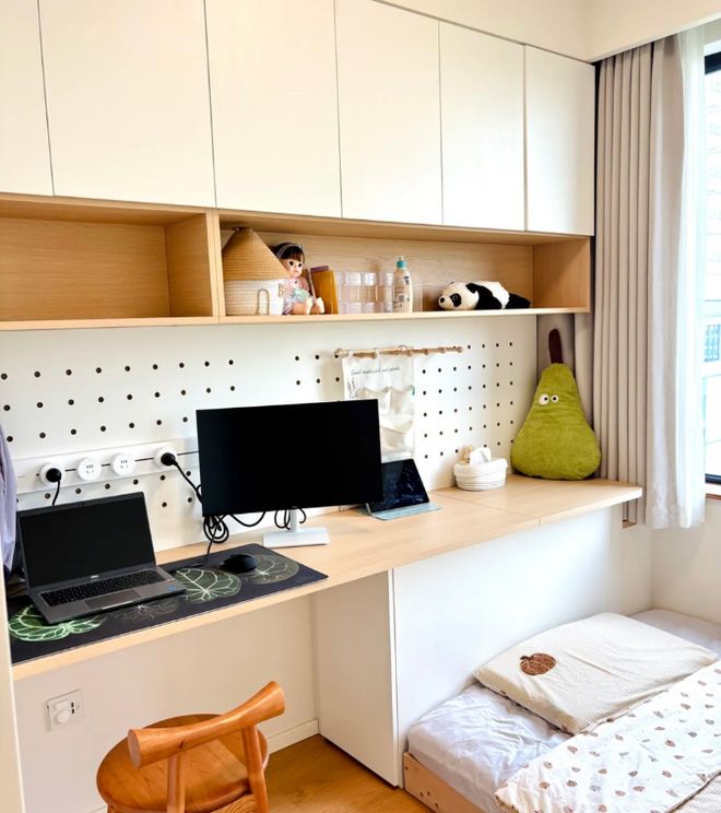 为了让书房灵活一些,这里大体采用了儿童房相似的布局,但却没有做地台床,而是用一个床板进行替代。