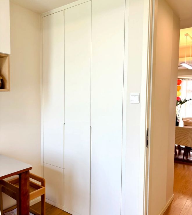 儿童房原本就留出了衣柜的空间,也就顺势做成嵌入式,与墙壁开关位置齐平。