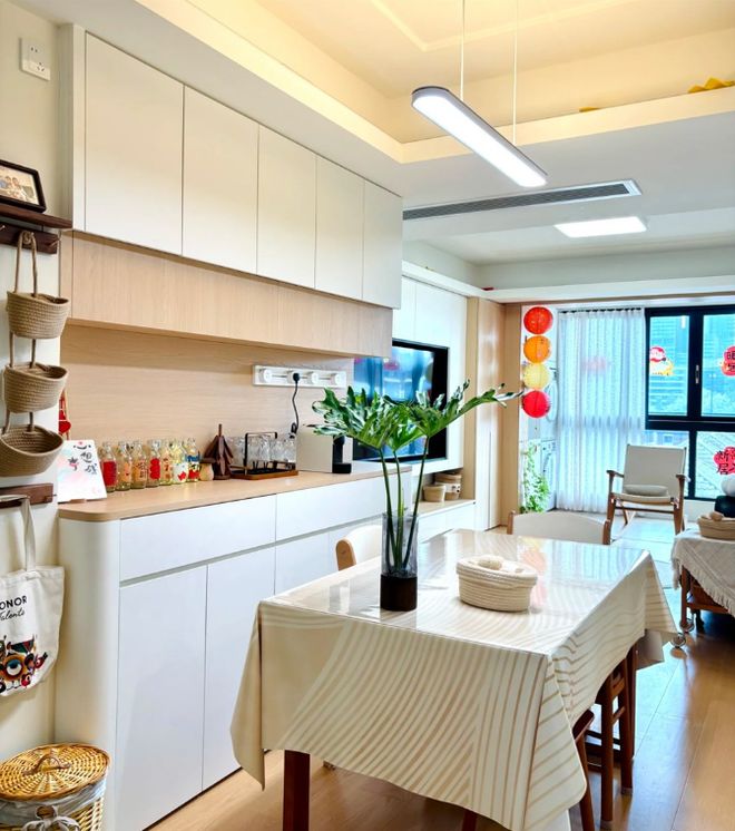 说实话,一开始我是觉得成品餐边柜更好看一些,但一方面是成品柜空间不足,另一方面是无法将纵向空间充分利用起来,最后还是选择了做定制柜。