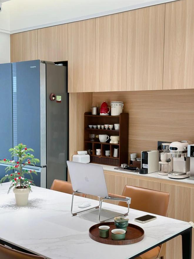前期就想在吧台上放一些常用的小家电,所以提前预留了充电位,摆放上我喜欢的咖啡机☕️、饮水机、茶具,就是全家最休闲放松的区域。