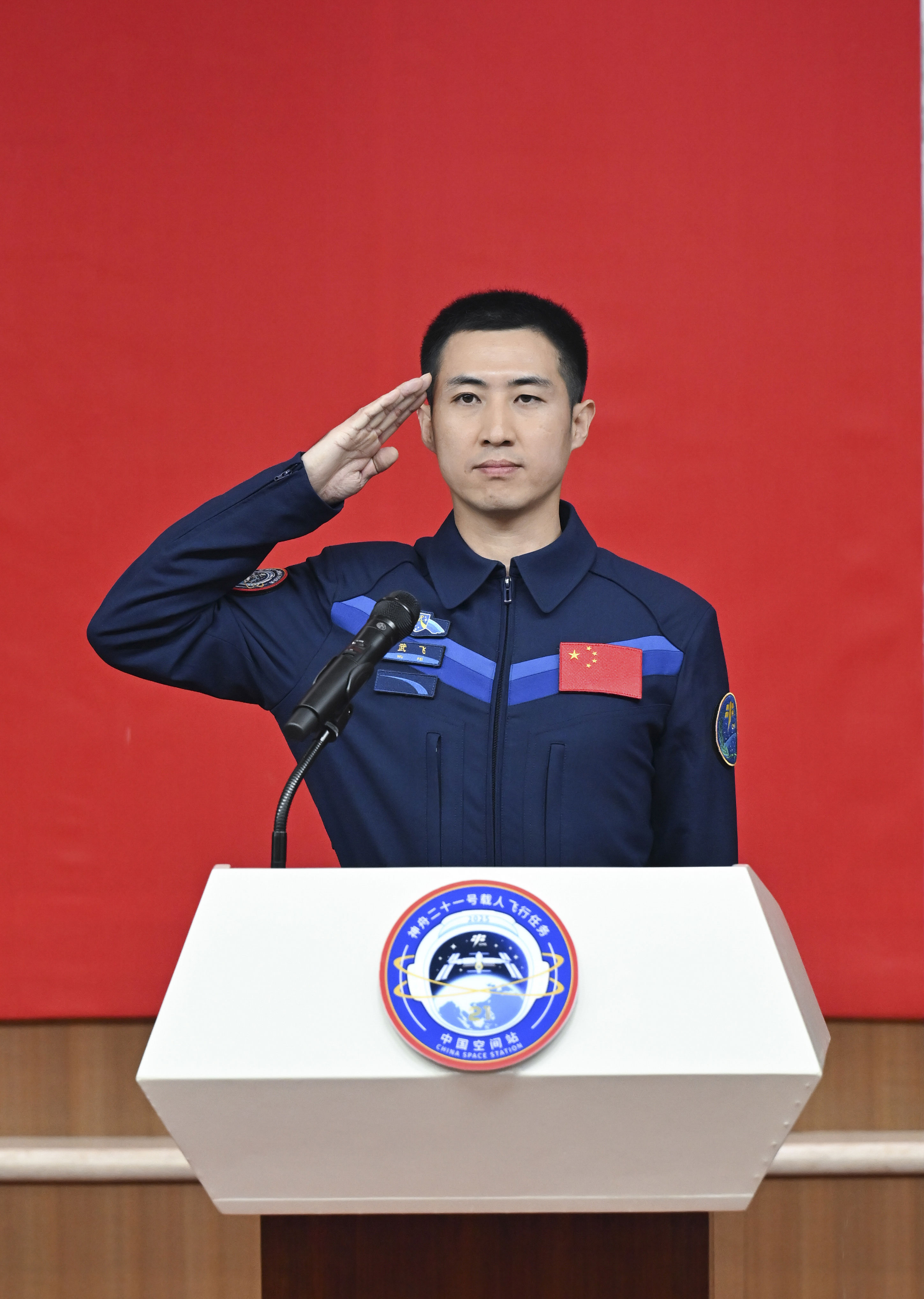 10月30日,神舟二十一号航天员乘组在酒泉卫星发射中心问天阁与中外媒体记者集体见面。这是航天员武飞与媒体记者见面。图/新华社