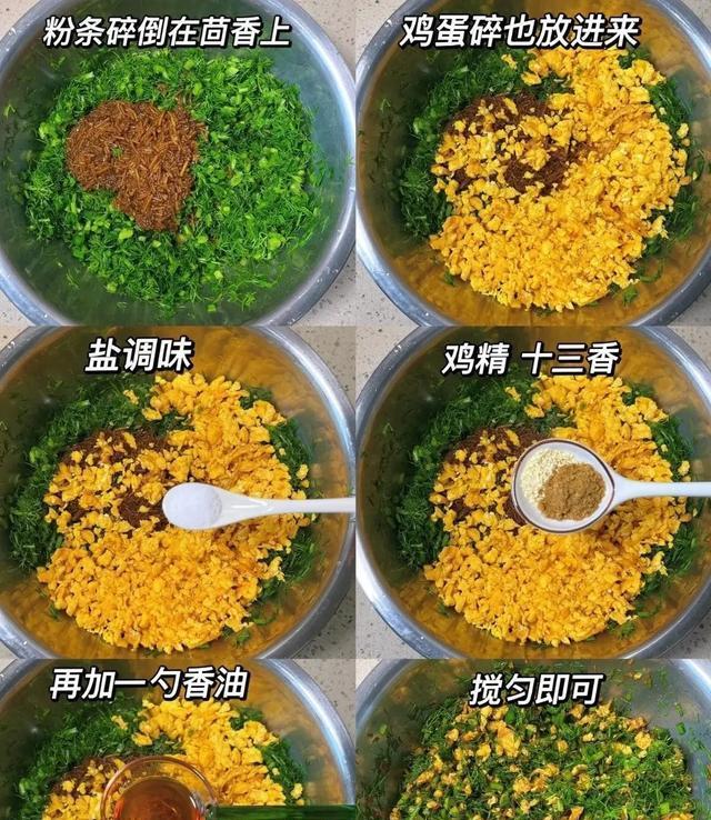 1. 茴香、韭菜分别择洗干净,切碎后放入大碗,加1勺食用油拌匀(锁住水分,避免出水);