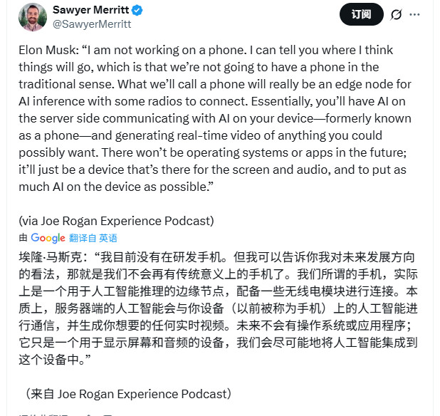 埃隆·马斯克谈到了即将到来的新时代——那时各种设备将充当AI接口的边缘节点,使传统的操作系统、应用程序以及通讯服务彻底过时。