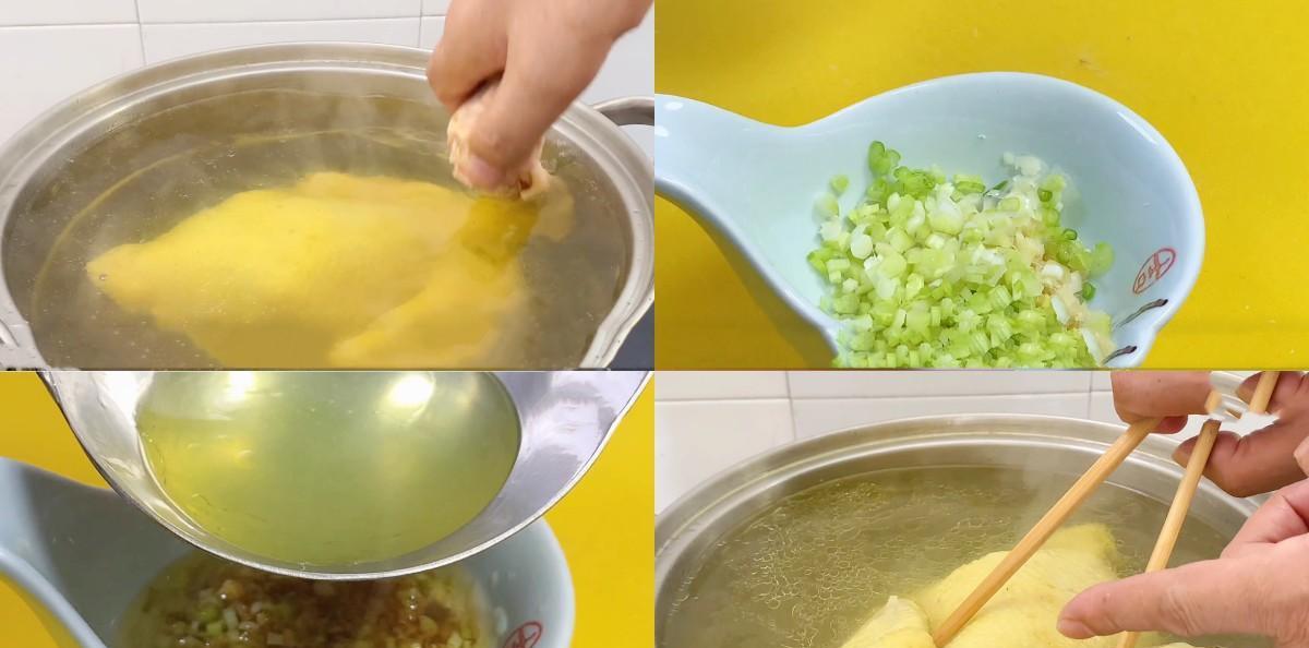 8、接下来往里面放入葱姜蒜末 再放入辣椒段 然后放入葱花 浇入热油 激发出香味,美味好吃的水煮豆腐皮就做好了。