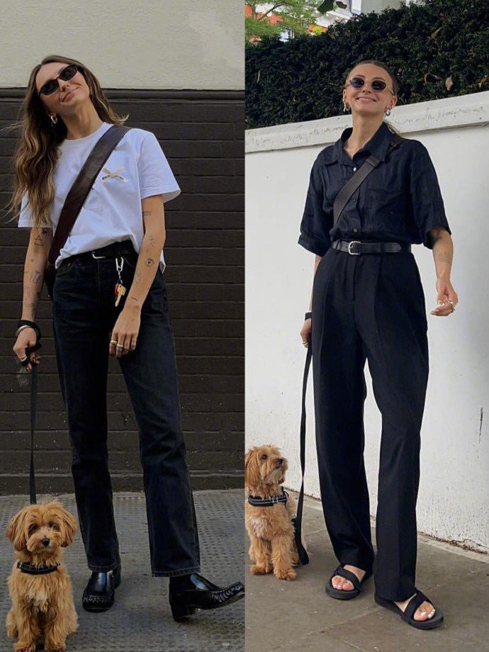 在比例优化上,Chloe Hayward 的技巧简单又好操作,156 小个子跟着学几乎不会出错。她最常用的是 “上短下长 + 同色系延伸” 的组合,比如浅棕色短款针织开衫内搭白色短 T 恤,下身搭配深棕色高腰直筒裤,脚上穿一双同色系的短靴,整套造型用同色系串联,没有明显的色彩分割,再加上 “上短下长” 的版型搭配,视觉上能让腿长至少显长 5 厘米;面对容易显臃肿的宽松单品时,她会用 “细腰带 + 露脚踝” 的方式来调整,比如穿宽松的长款衬衫时,在腰间系一条细巧的皮质腰带,轻轻勒出腰线,再搭配短裤打造 “下衣失踪” 的效果,脚下穿一双浅口单鞋露出脚踝,既保留了衬衫的慵懒感,又不会让宽松的版型显得拖沓;她还很擅长用 “鞋款延伸腿部线条”,156 身高的她很少穿笨重的厚底鞋,反而偏爱裸色浅口单鞋、黑色细跟短靴,这些鞋款要么能和肤色衔接,要么能露出脚踝,从视觉上延长腿部线条,让整体比例更协调。