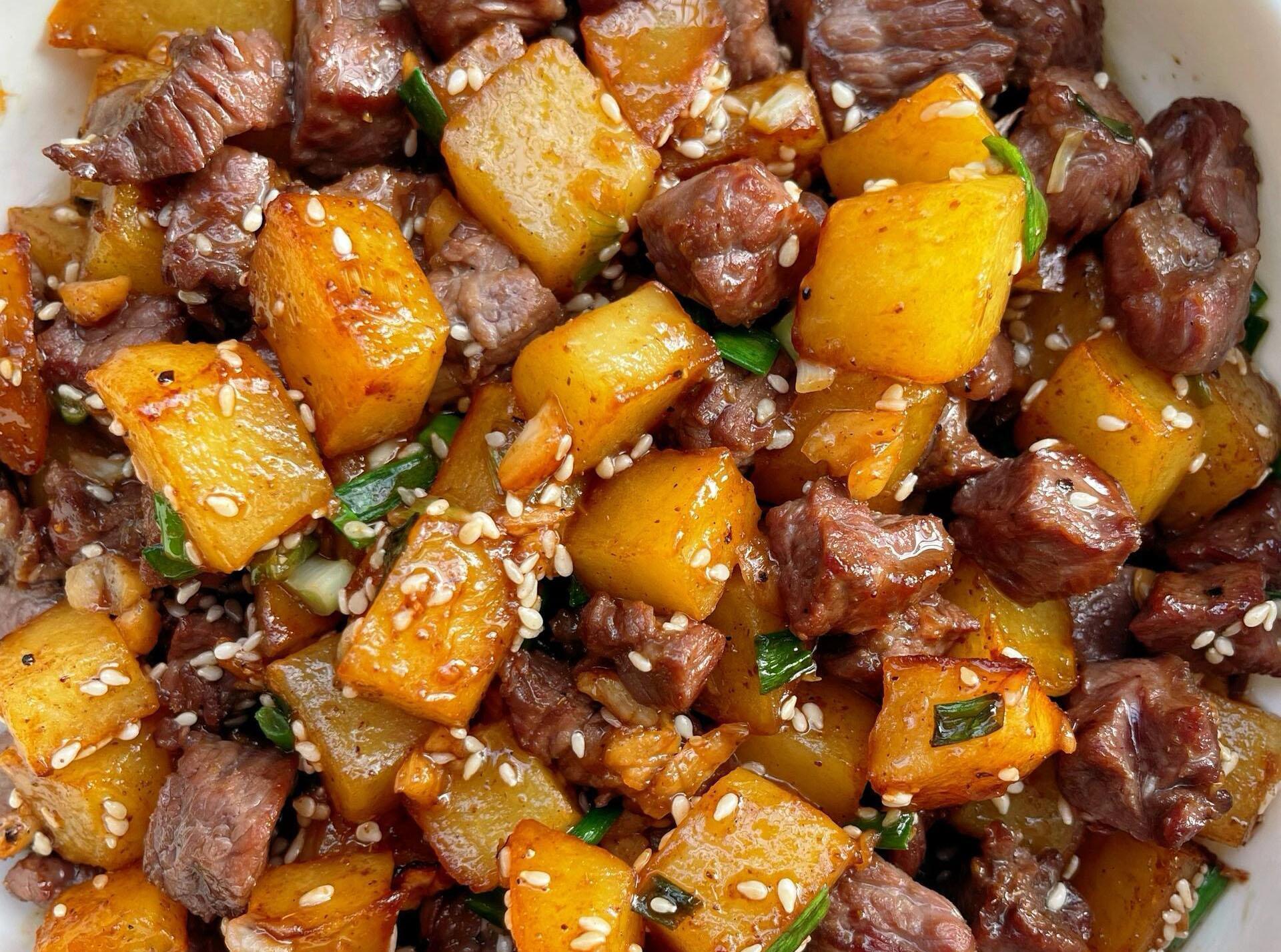 底油爆香蒜末葱白,大火爆炒牛肉粒至变色,加入土豆,调入盐和孜然粉。